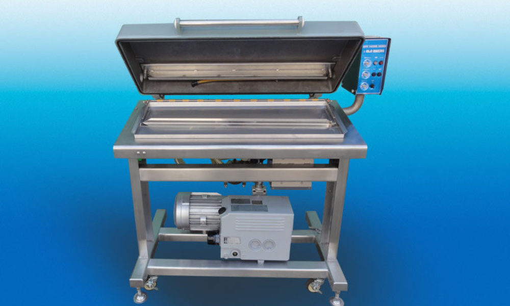 定盤及びフレームはステンレス製、真空ボックスは特殊アルミ鋳物製で、機械角度が変更できるので、液物の包装にも適します。(水平、10°、20°)